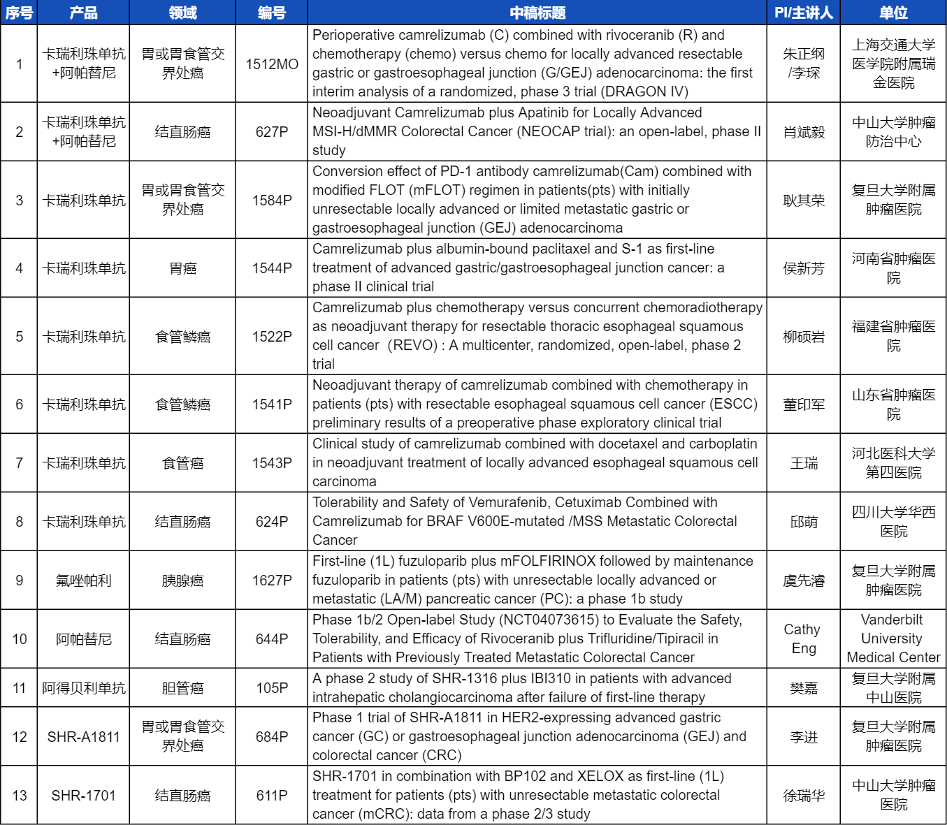 在消化系统肿瘤领域,ag真人国际官网创新产品相关研究共入选1项口头报告和12项壁报展示。除了经典的明星药物卡瑞利珠单抗和阿帕替尼,SHR-A1811、SHR-1701等未上市创新产品也有相应研究入选。此外,阿得贝利单抗、氟唑帕利等已上市药物也在积极探索新的适应症,本次ESMO大会分别有肝内胆管癌和胰腺癌相关研究入选。这些新老药物前沿研究的不断出现,有望为消化系统肿瘤患者带来新的福音!