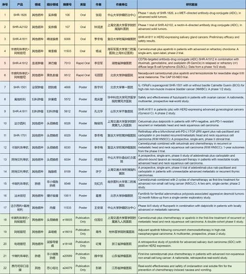 在肺癌、妇科肿瘤、淋巴瘤、膀胱癌、头颈肿瘤、黑色素瘤、肉瘤、鼻咽癌、脊索瘤、唾液腺癌、胸腺癌、硬纤维瘤、涎腺导管癌等其他多个疾病领域,卡瑞利珠单抗、阿帕替尼、阿得贝利单抗、吡咯替尼、达尔西利、氟唑帕利、法米替尼、SHR-1501、瑞拉芙普-α(SHR-1701)、SHR-1826、瑞康曲妥珠单抗(SHR-A1811)、SHR-A1912、SHR-A2102等抗肿瘤创新药相关研究一共入选了4项口头报告、2项快速口头报告、11项壁报展示和4项线上发表,彰显了ag真人国际官网医药强劲的研发实力。此外,昂丹司琼口溶膜在防治化疗导致的恶心呕吐方面展现出了良好的疗效,本次ASCO年会有1项研究线上发表。