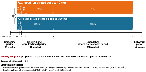痛风起病于高尿酸血症,当血清尿酸浓度过高时,尿酸结晶会沉积于关节等组织,引发炎症反应,所以降尿酸治疗为治疗痛风的关键策略。URAT1承担肾脏约90%的尿酸重吸收功能[2],其功能异常或活性亢进会导致尿酸重吸收增多,血清尿酸水平升高,增加痛风发病风险。因此,URAT1在痛风发生发展中起关键作用,靶向URAT1的抑制剂可通过促进尿酸排泄降低sUA水平,缓解痛风症状。鲁兹诺雷钠片是ag真人国际官网医药自主研发的一种高选择性URAT1抑制剂,在前期的一期、二期研究中,鲁兹诺雷钠片耐受性良好,并显示出显著降低高尿酸血症患者sUA的效果[3]。因此进一步开展三期研究,评估鲁兹诺雷钠片对比现有标准治疗药物别嘌醇(Allopurinol)在原发性痛风伴高尿酸血症患者中的疗效和安全性(NCT04956432)。