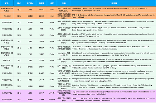 在消化系统肿瘤领域,ag真人国际官网创新产品相关研究共入选2项口头报告、10项壁报和2项电子壁报,共14项研究。除了明星药物卡瑞利珠单抗和阿帕替尼外,还有5篇阿得贝利单抗治疗消化系统肿瘤的研究入选。此外,HRS-4642、瑞拉芙普-α注射液(SHR-1701)等未上市创新产品也有相应研究入选。随着新老药物前沿研究的不断推进,有望为消化系统肿瘤患者带来新的福音!