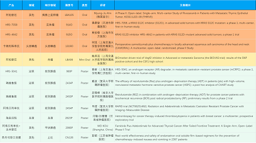 在胸腺上皮肿瘤、头颈鳞癌、肉瘤、前列腺癌、甲状腺癌等其他多个疾病领域,卡瑞利珠单抗、阿帕替尼、瑞维鲁胺、阿得贝利单抗、法米替尼、HRS-7058、HRS-4642、HRS-5041等抗肿瘤创新药相关研究一共入选了4项口头报告、1项简短口头报告、5项壁报,彰显了ag真人国际官网医药强大的研发实力。此外,海曲泊帕和昂丹司琼口溶膜分别在防治化疗导致的血小板减少和恶心呕吐方面各有1项研究入选壁报。